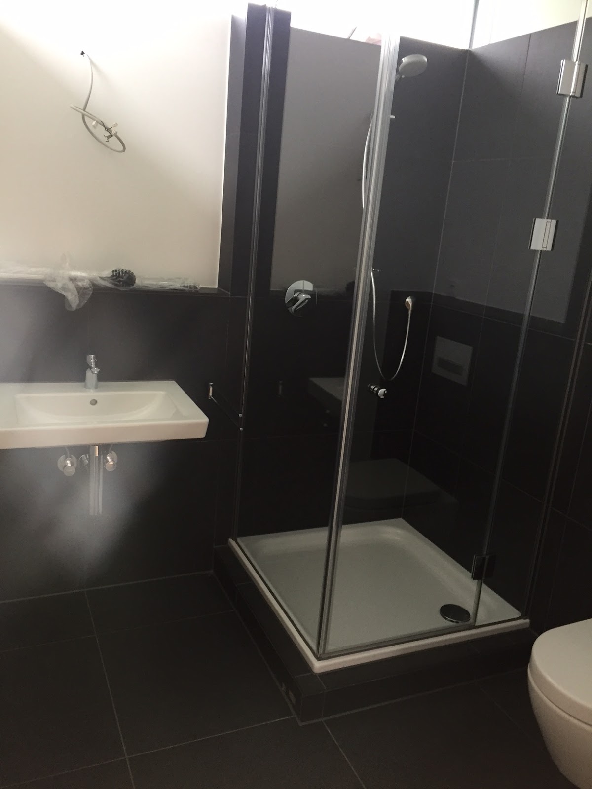 Gleich links neben dem Eingang befindet sich das Gäste-WC. Bis auf den Boden und der nicht ebenerdigen Dusche ist der Bauherr komplett im Standard geblieben.
